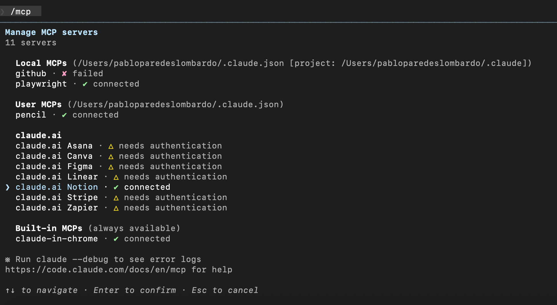 Así que la decisión fue simple: si ya paso la mayor parte del tiempo en Notion, que Claude Code escriba directo ahí. El MCP de Notion lo hace fácil; una configuración y ya puedes leer, editar y crear páginas desde la terminal.